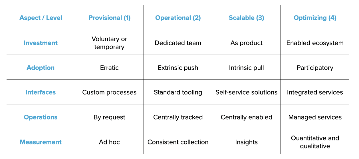 Målinger dekker hvordan prosessen med å måle suksessen til plattformen, det spenner fra ad-hoc til en kultur for kontinuerlig forbedring. Her ser vi den laveste modenheten på tvers av bordet, med ingen organisasjoner som er høyere enn nivå 2 og en 50/50 fordeling mellom nivå 1 og 2. Jeg antar at dette er området vi må fokusere på i årene som kommer.